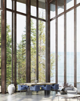 Façades of full bed limestone and weathered steel blend the residence into the quiet surrounding forest, while a monopitch weathered steel roof extends dramatically past the outer walls, aiming into the sky above Georgian Bay.